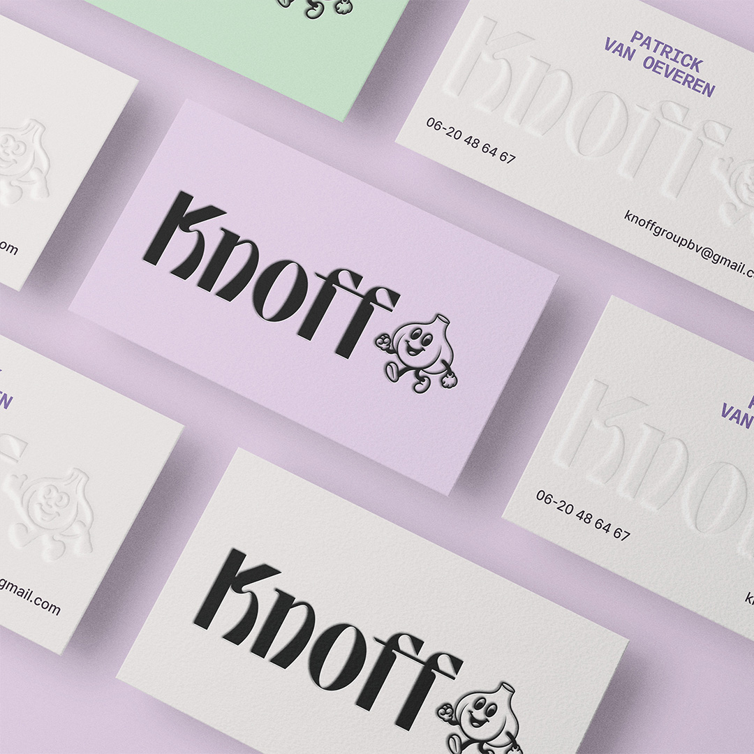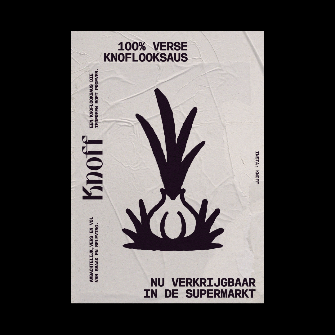 The logo is inspired by what lies at the heart of Knoff: garlic. The typographic wordmark takes its shape from the organic curves of a garlic bulb and gives a modern, playful twist to classic Italian letterforms. Its custom serifs and sharp ink traps are visual nods to the stem and the bold character of garlic itself.